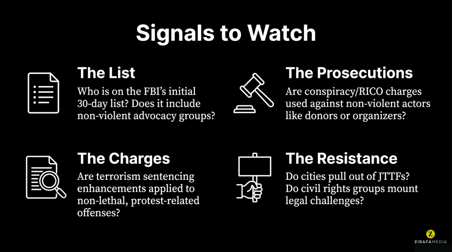 The 30-day list. The FBI’s initial compilation of groups “engaged in acts that may constitute domestic terrorism” will set the baseline. Watch for leaks or FOIA requests revealing how broadly the criteria are applied—and whether advocacy organizations with no history of violence appear.