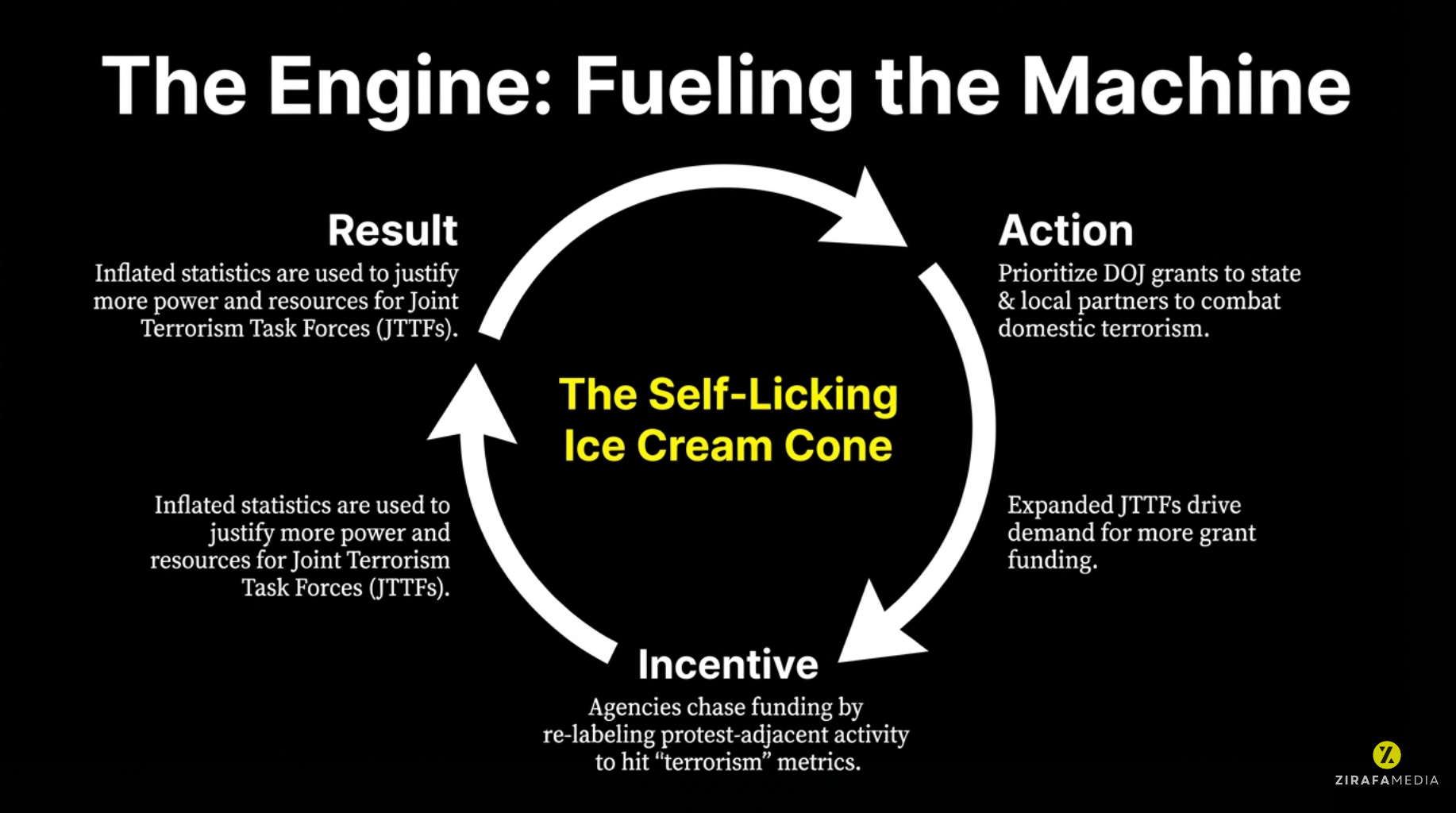 The logic is circular, what analysts sometimes call a “self-licking ice cream cone.” Define broad ideological indicators as terrorism clues. Fund agencies to chase “domestic terrorism” cases. Re-label protest-adjacent activity as terrorism to hit metrics. Use inflated stats to justify keeping and expanding the powers.
