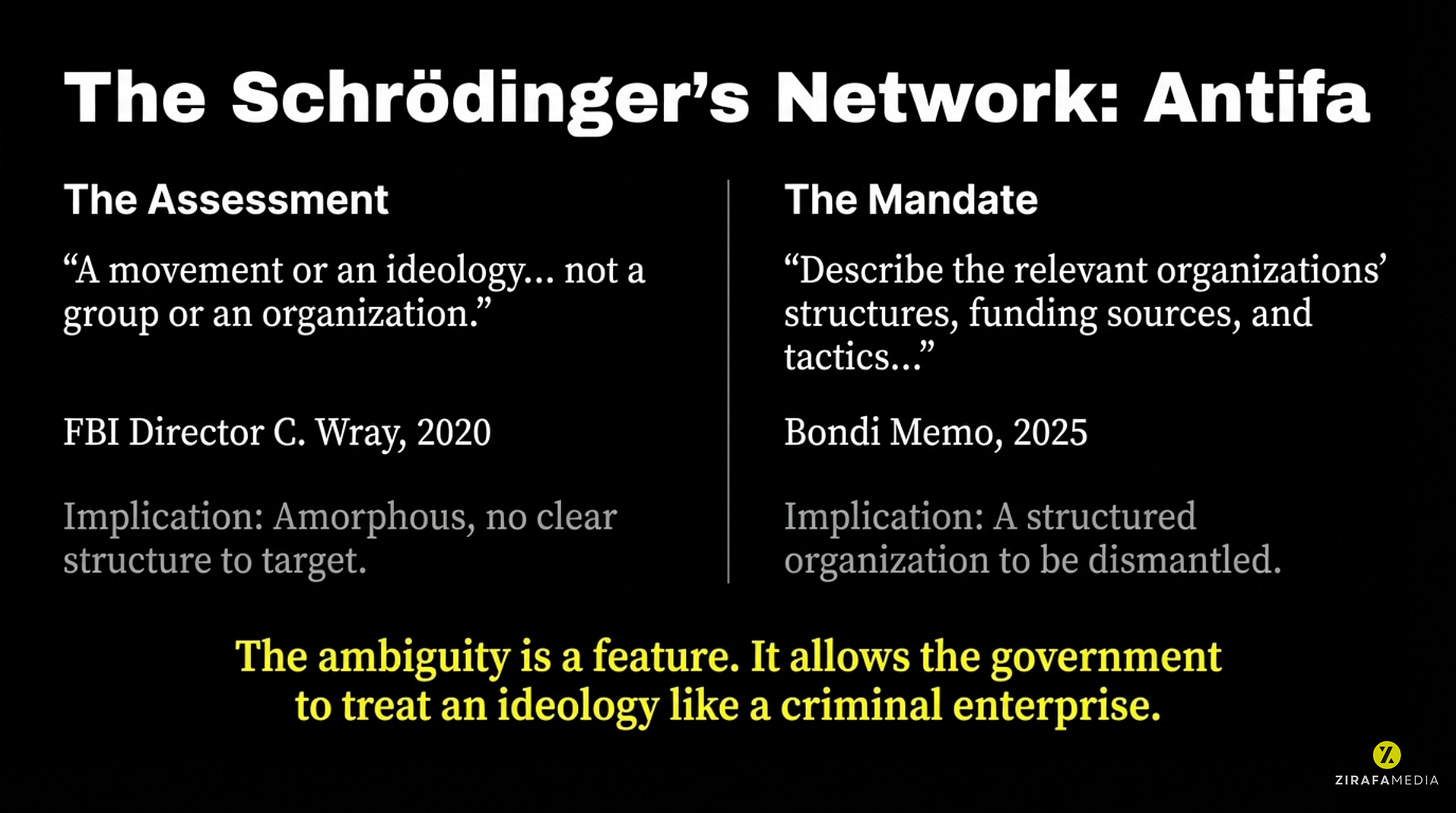 This ambiguity is a feature, not a bug. It allows the government to have it both ways. When challenged legally: “Antifa isn’t a membership organization; we’re just targeting criminal acts, not beliefs.” When talking to political allies or the media: “Antifa is a vast, organized terror network; we have lists of its groups and leaders.”
