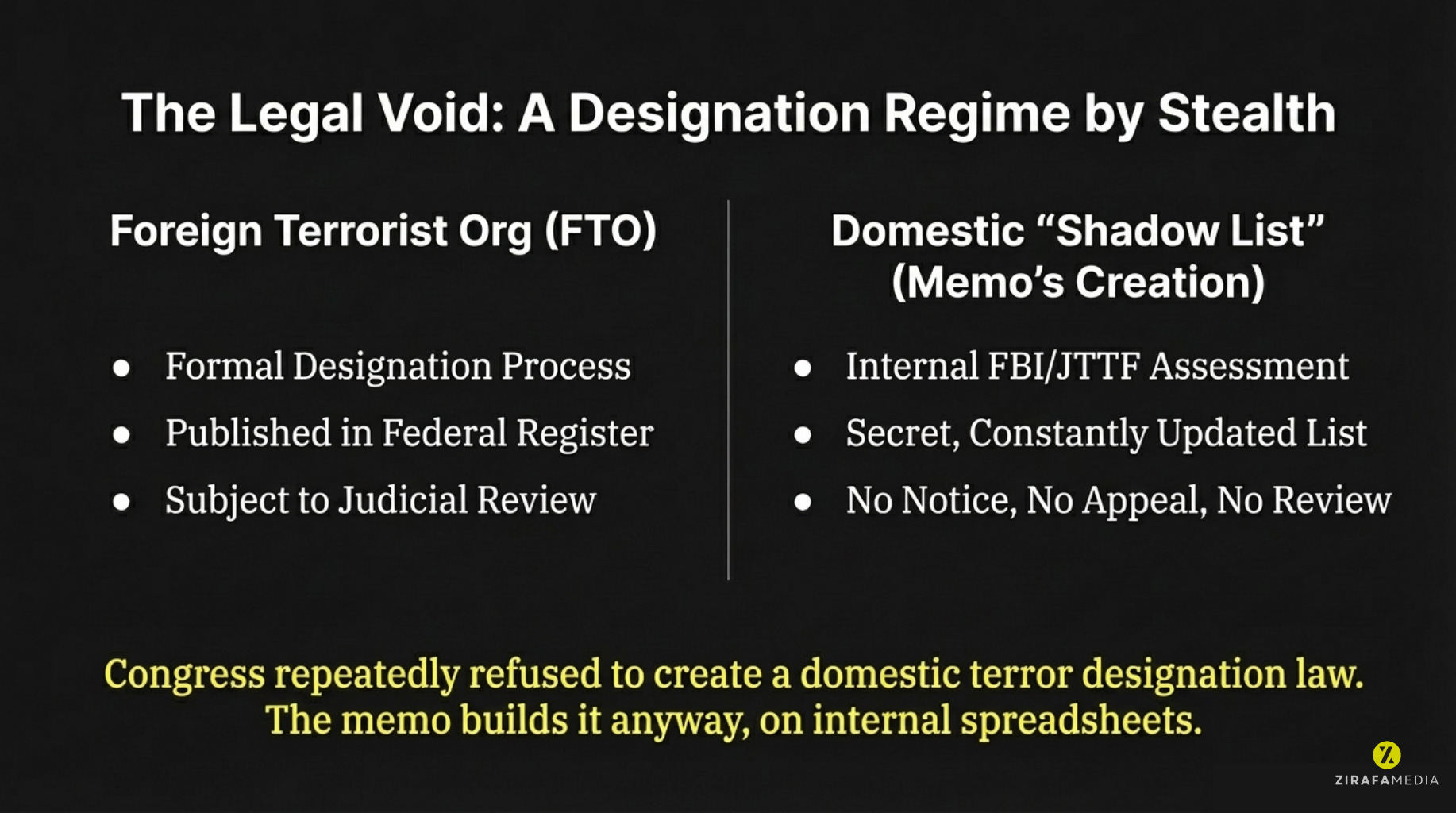 The memo, obtained by Bloomberg Law and reviewed by Reuters, operationalizes President Trump’s September 25 National Security Presidential Memorandum-7, itself issued two weeks after Kirk’s killing. Together, these documents construct something Congress has repeatedly refused to create: a domestic equivalent to the foreign terrorist organization designation—without any of the procedural safeguards that make FTO listings subject to judicial review.