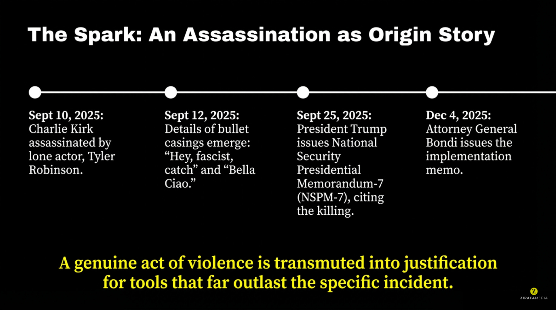 Every expansion of state security power needs an origin story. For the post-9/11 architecture, it was the towers falling. For the Bondi memo, it’s the killing of Charlie Kirk.