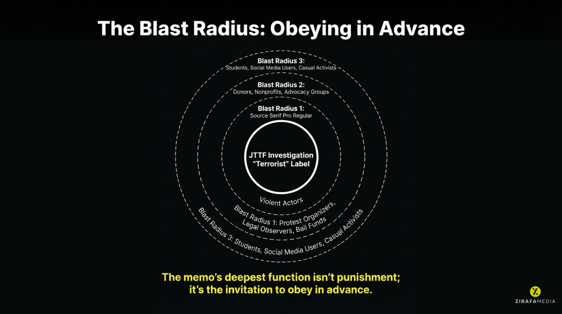 Obeying in advance. Most people swept into this framework will never face prosecution. They don’t need to. As constitutional scholar Steve Vladeck has argued, frameworks like NSPM-7 are “legally empty but rhetorically dangerous,” designed to make people “obey in advance” even though they create few new substantive rules. The Bondi memo operationalizes that logic. The real power of a shadow designation regime lies in the behavior it deters before any knock on the door. Nonprofits cancel protests rather than risk a JTTF file. Donors quietly pull back from controversial causes. Students skip a march or delete a post rather than gamble on how “radical gender ideology” will be interpreted five years from now.